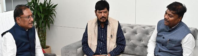 मुख्यमंत्री साय से आज मंत्रालय महानदी भवन में केंद्रीय सामाजिक न्याय एवं अधिकारिता राज्य मंत्री श्री रामदास अठावले ने सौजन्य मुलाकात की। मुख्यमंत्री साय ने शॉल, श्रीफल एवं स्मृति चिन्ह भेंट कर उनका आत्मीय स्वागत किया।