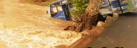 बस यात्री जान बचाने के लिए पुलिया के पास लगे पेड़ पर चढ़ गए